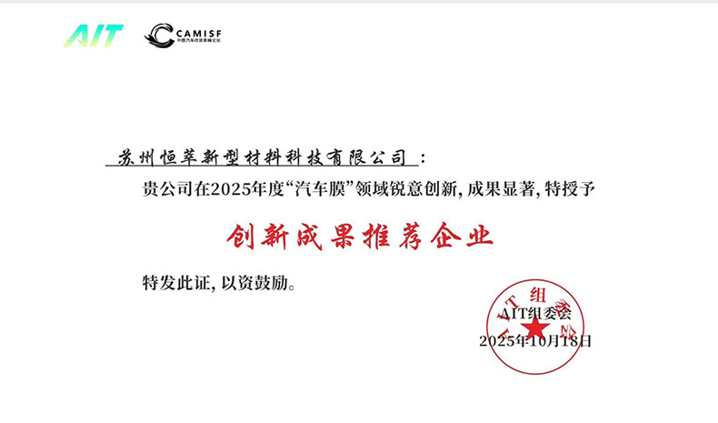 蘇州恒萃新型材料科技有限公司榮獲2025年度“汽車膜”領域銳意創新成果推薦企業